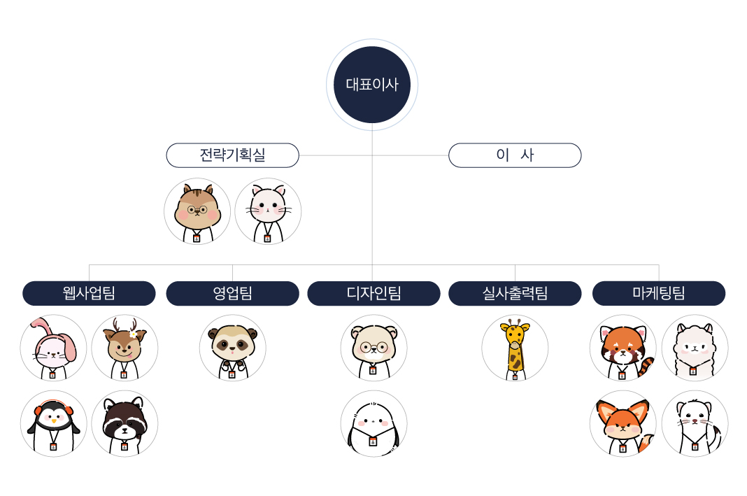 전략기획실 / 웹사업팀 / 마케팅팀 / 영업팀 / 디자인팀 / 실사출력팀으로 구성되어 있고,