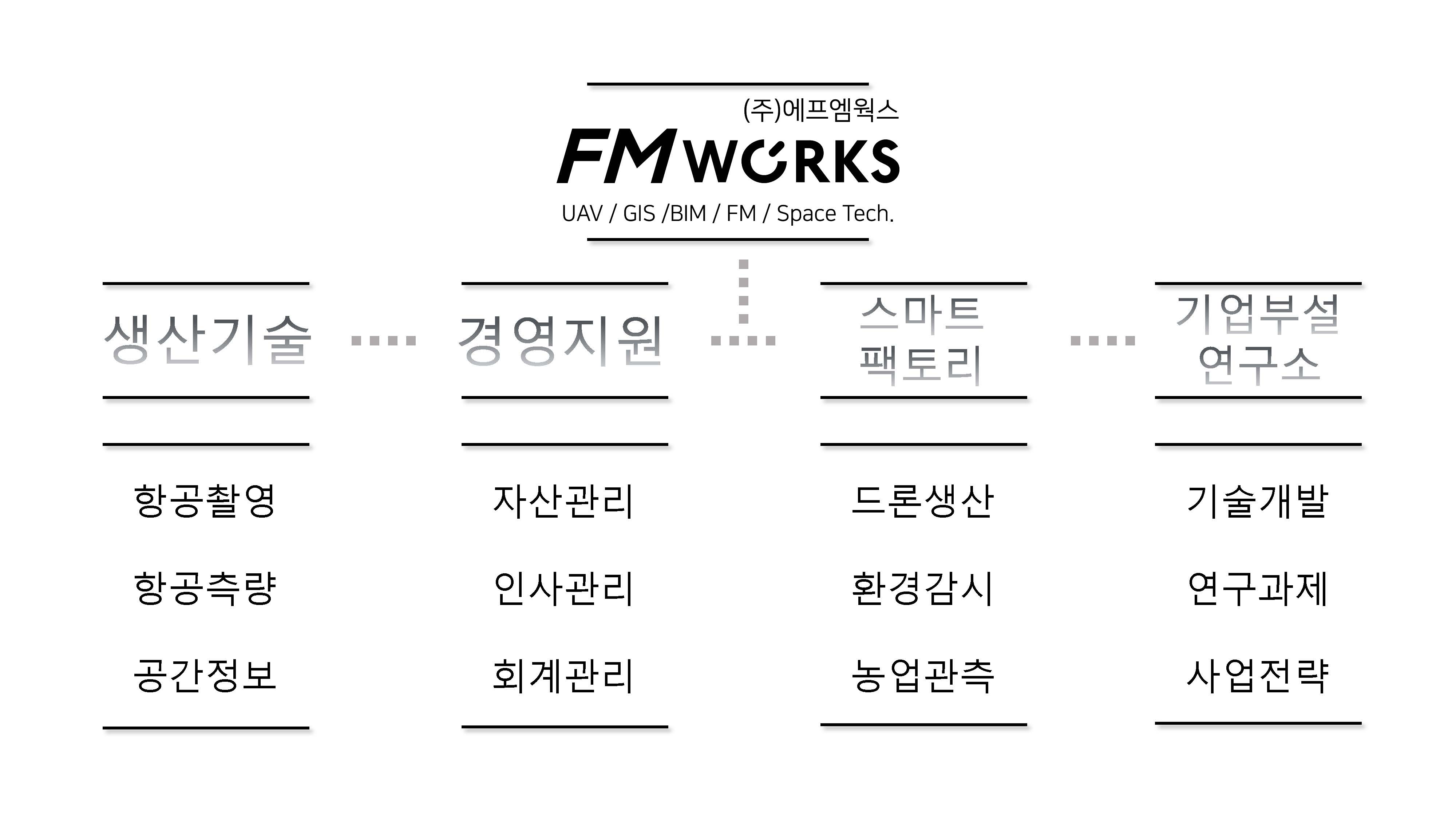 주식회사 에프엠웍스는 도시와 인간, 인간과 도시의 친환경적이고 유기적인 연계를 위해 우수한 인재를 바탕으로 미래가치를 창조하는 기업입니다. 공간기술을 바탕으로 드론, 스마트건설, 산림관리, 환경감시, 문화재관리, 시설물 유지관리, 재난안전, 인공지능 등 다양한 산업현장에서 미래 기술 혁신을 선도하고 있습니다. 에프엠웍스는 2010년 창사 이래 수차례 위기에서도 창조적 신기술 개발을 위한 노력을 아끼지 않았습니다. 2018년 대한민국 드론업계에서 최초로 산림기술경연 국토부장관상을 수상하였으며 이를 바탕으로 2019년 과학기술정보통신부 디지털이노베이션 대상을 수상하였습니다. 격변하는 드론시장에서도공간기술을 선도하는 기업이 되고자 임직원 모두가 최선을 다해서 노력하고 있습니다. 경험적 노하우를 바탕으로 공간기술의 본질을 발전시키는 기술혁신은 계속될 것입니다. 사람과 환경의 미래가치와 행복에 기여하는 주식회사 에프엠웍스의 발전을 응원해주십시오. 감사합니다.